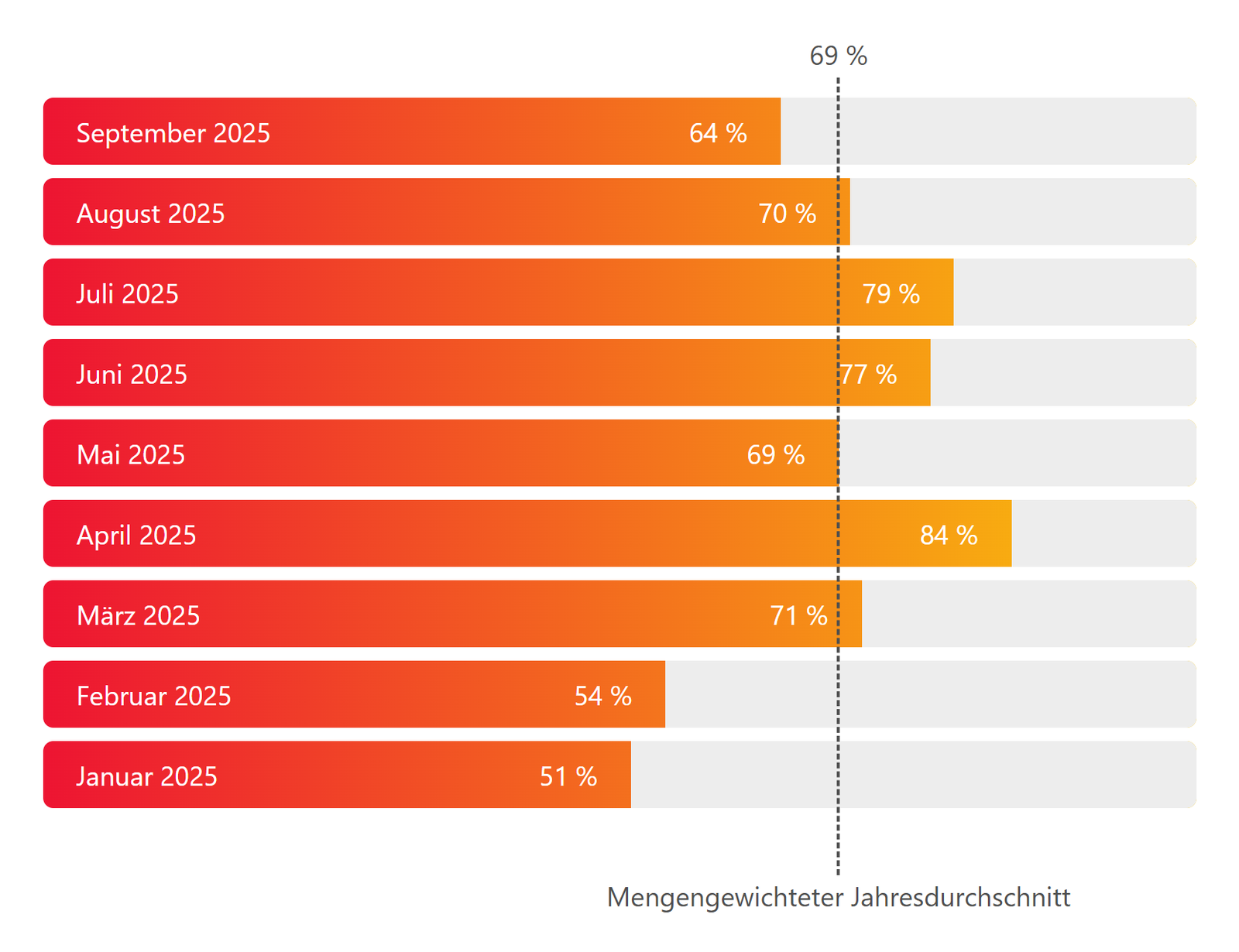 Hier findest du die aktuellen Deckungsgrad-Werte einer vergleichbaren Gemeinschaft der letzten Monate – sie zeigen, wie viel des Energiebedarfs bereits durch eigene, erneuerbare Quellen gedeckt werden kann. Das heißt, dass in dieser Energiegemeinschaft 69% des Stromverbrauchs aus Anlagen der Energiegemeinschaft bzw. privaten Einspeisern kommen und 31% vom Energieversorger bezogen werden.